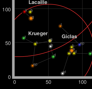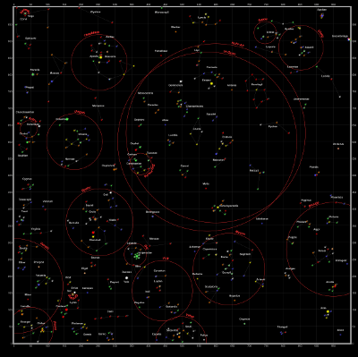 For this tutorial we’ve picked a starmap from Star Control II, a game that is now available as the open-source project The Ur-Quan Masters. These maps were made with a tool to read the open-source data files of the game (webpage seems to have been taken down, see the archived version), and look like this: